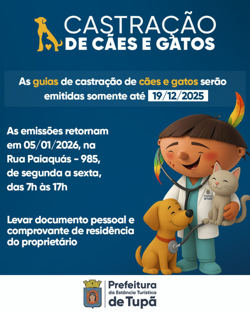 A distribuição de guias para tutores interessados em castrar cães e gatos vai ser feita até a próxima sexta-feira (19). O formulário pode ser retirado na sede da Subsecretaria de Proteção e Bem Estar Animal, que fica na rua Paiaquás, 985, diariamente das 7h às 17h.