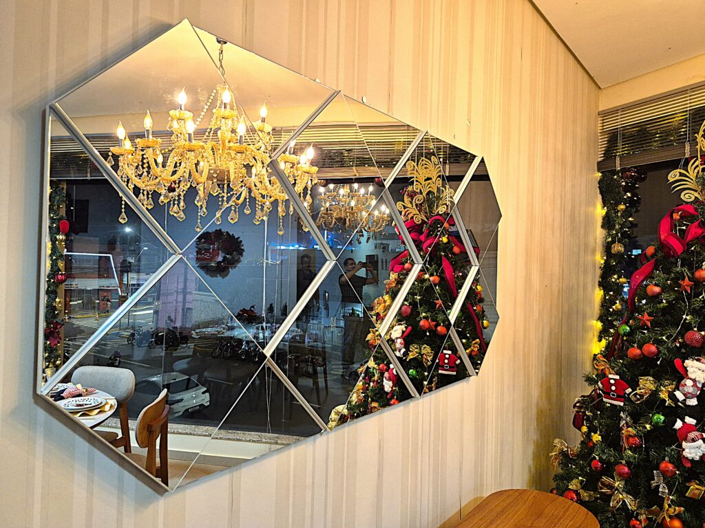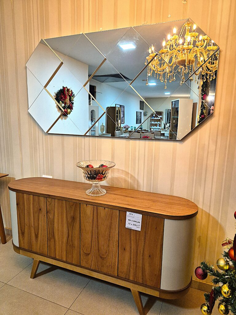 Para quem busca sofisticação nos detalhes, o Espelho Decor de 1,70 metro chama a atenção pelo design imponente e acabamento de puro luxo, compondo um ambiente elegante ao lado do Balcão Vigo, combinação que valoriza halls, salas de jantar e espaços integrados.