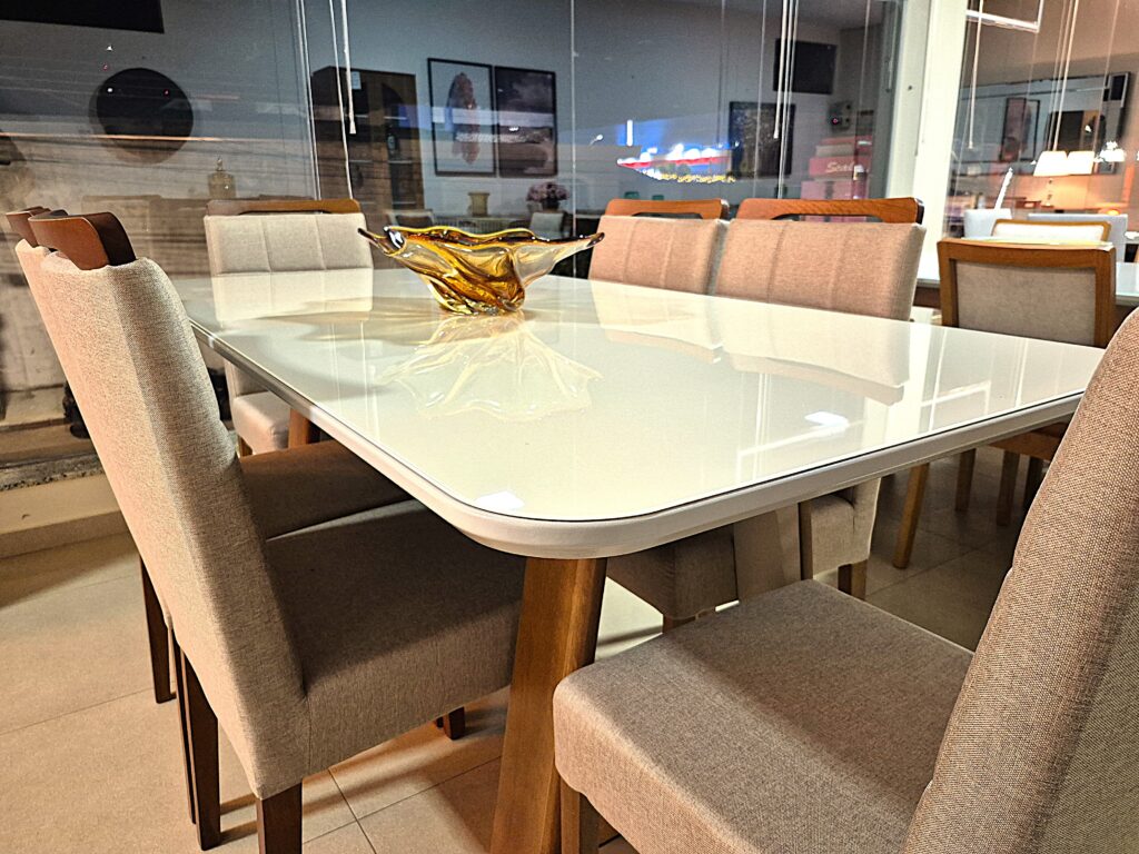 Na linha de jantar, a Mesa Paris, com 1,80 metro, acompanhada de seis cadeiras Athenas, se destaca pelo equilíbrio entre beleza e funcionalidade, ideal para reunir a família com conforto e estilo.