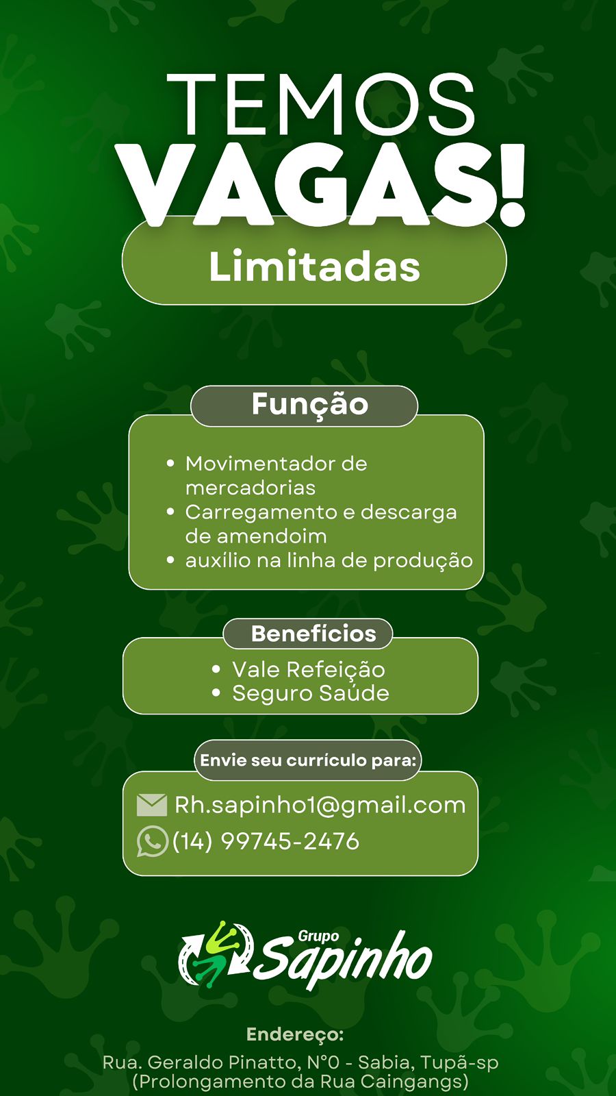 O GRUPO SAPINHO, tradicional empresa tupãense com mais de 25 anos no mercado, está com 10 vagas abertas para arrumador e movimentador de mercadorias e uma para o RH. Em plena expansão, a empresa — antes Sapinho Carga e Descarga — atualizou seu nome e construiu uma nova sede, no prolongamento da Rua Caingangs, no