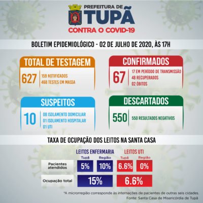 A nova atualização do boletim epidemiológico do coronavírus divulgada pela Prefeitura de Tupã nesta quinta-feira (02/07) mostra que mais 3 casos suspeitos tiveram resultado negativo para a doença, todos em isolamento domiciliar. Ainda segundo a Secretaria Municipal de Saúde, mais 1 caso foi confirmado, com o paciente em isolamento domiciliar. Também foram registrados mais 4 […]