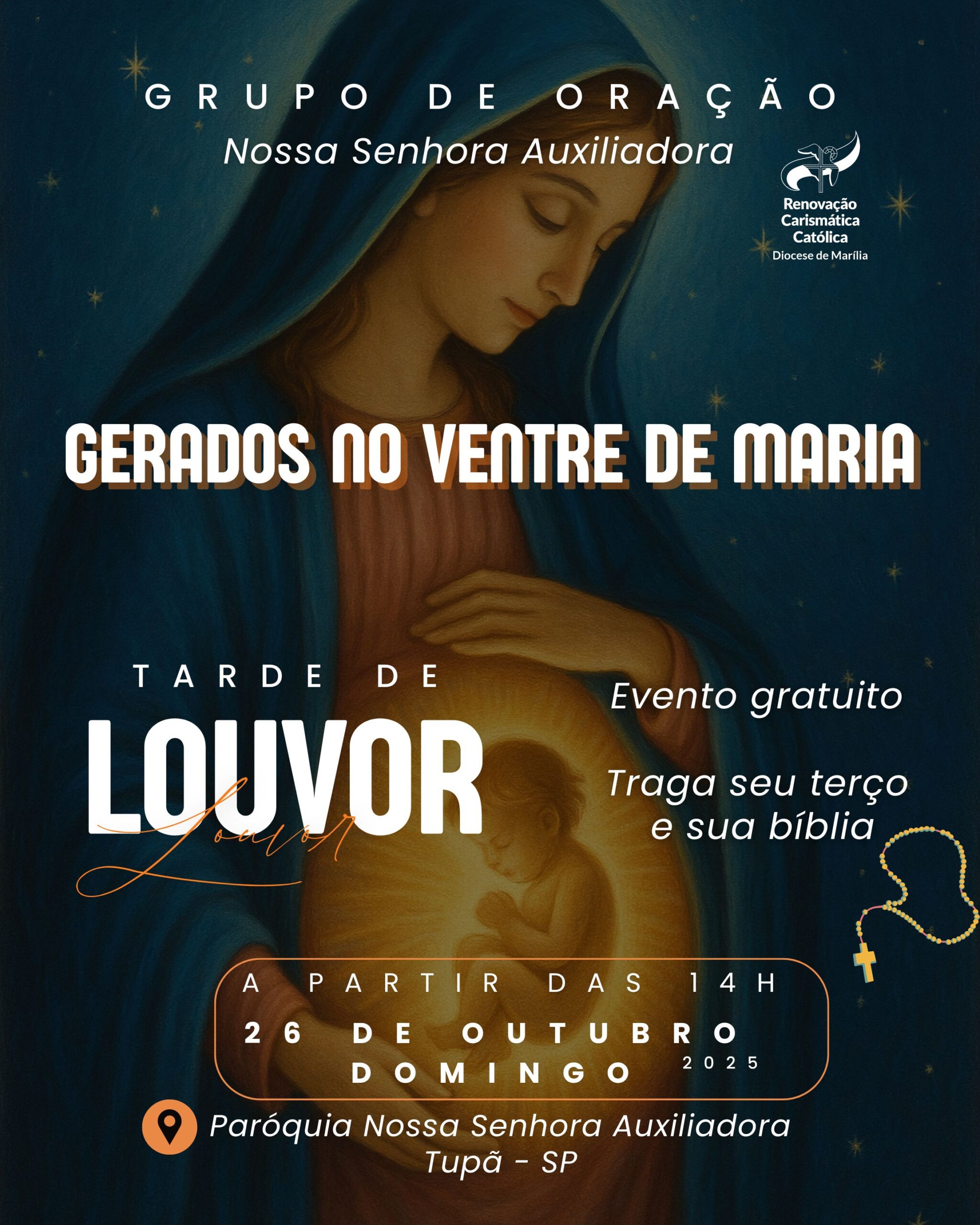 A Paróquia Nossa Senhora Auxiliadora, em Tupã, será palco neste domingo, 26 de outubro, de um momento especial de fé e espiritualidade: a Tarde de Louvor, Gerados no Ventre de Maria, promovida pelo Grupo de Oração Nossa Senhora Auxiliadora, ligado à Renovação Carismática Católica da Diocese de Marília. O evento, gratuito e aberto a toda […]