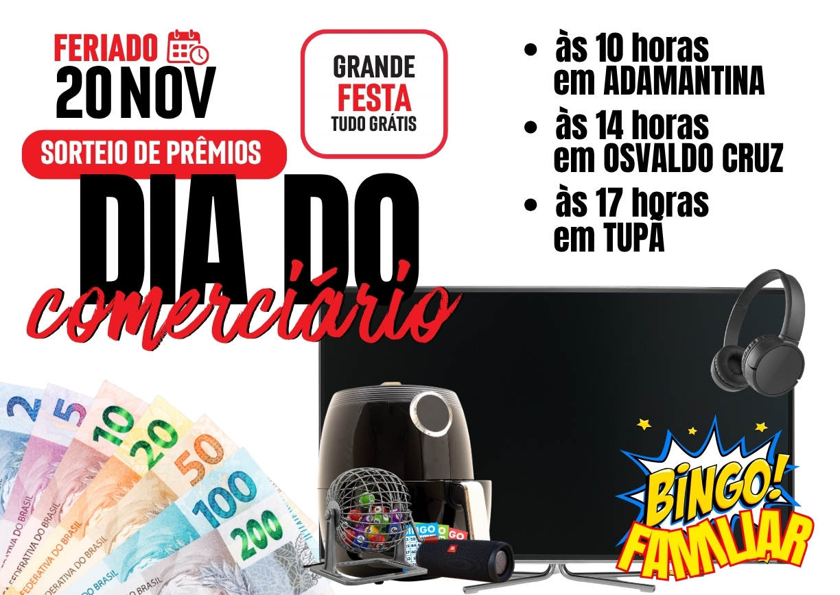 O Dia do Comerciário, celebrado em 30 de outubro, terá a sua tão esperada comemoração no dia 20 de novembro, com grandes festas gratuitas promovidas pelo Sincomerciários de Tupã e região. A data, que cai em feriado, reunirá trabalhadores e familiares em três cidades: Adamantina, Osvaldo Cruz e Tupã, com programação especial, bingo cultural, sorteios […]