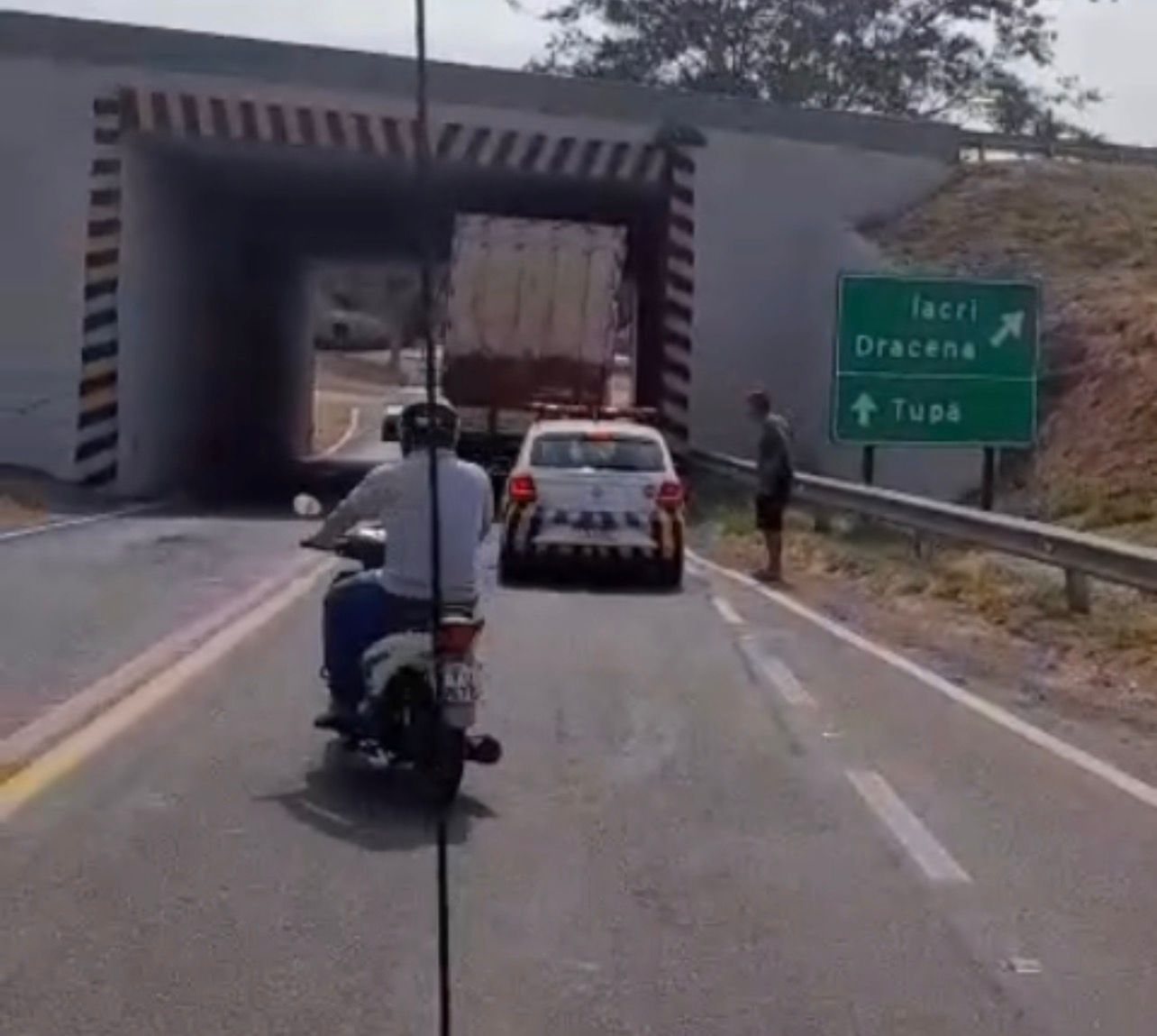 Caminhão enrosca em viaduto na vicinal Adelelmo Piva, em Tupã